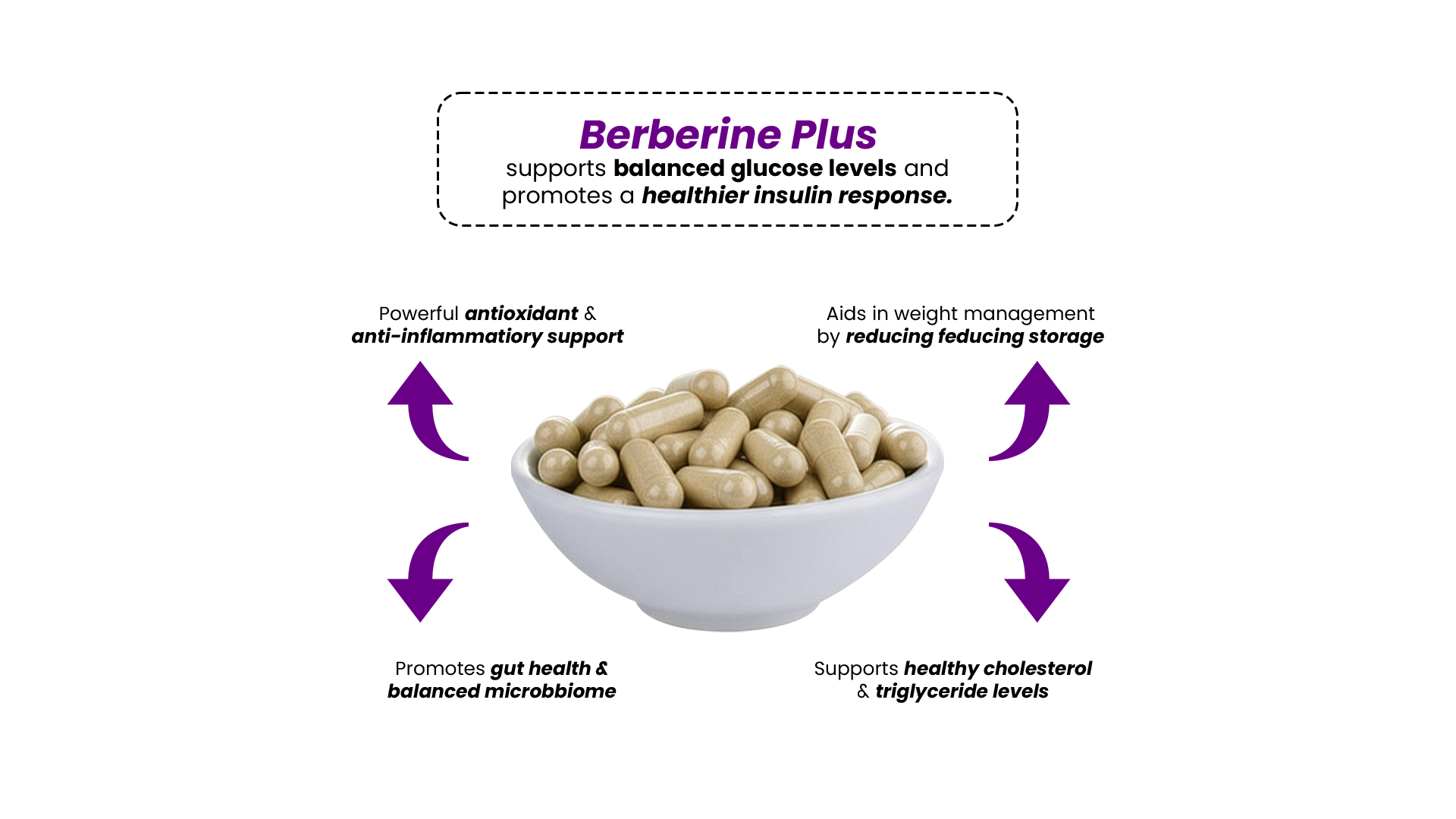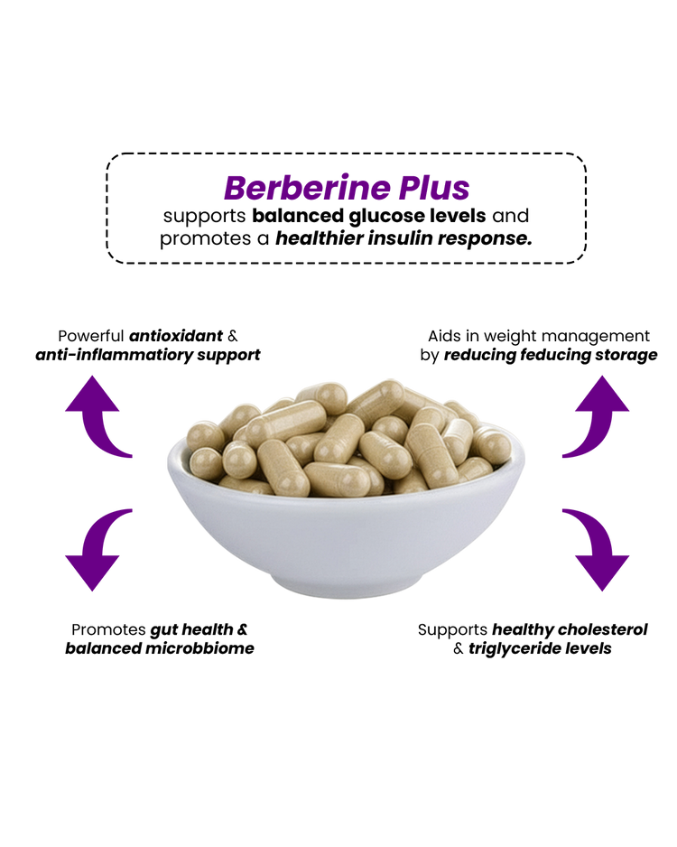 Berberine helps support steadier glucose—the spikes/crashes that can sabotage progress. Pair with protein + fiber, good sleep, and regular movement for the best outcomes.*